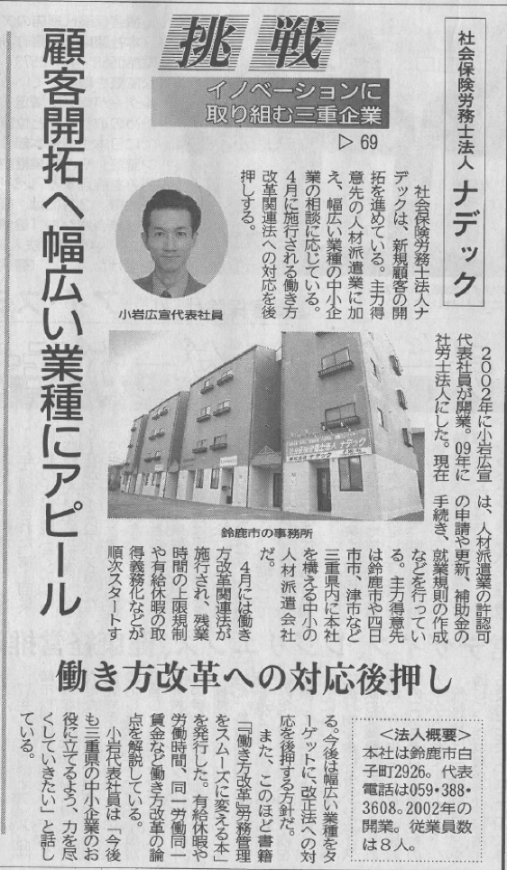 三重 鈴鹿 四日市 津市 社会保険労務士(社労士)法人ナデック > お知らせ > 「中部経済新聞」2019年3月15日号で弊社の活動が紹介されました。
