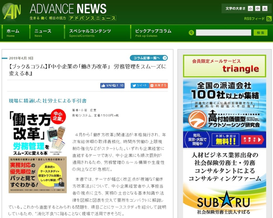 インターネットのニュースサイト「アドバンスニュース」に2019年4月9日付で、新刊『中小企業の「働き方改革」労務管理をスムーズに変える本』(秀和システム)の書評コラムが掲載されました。