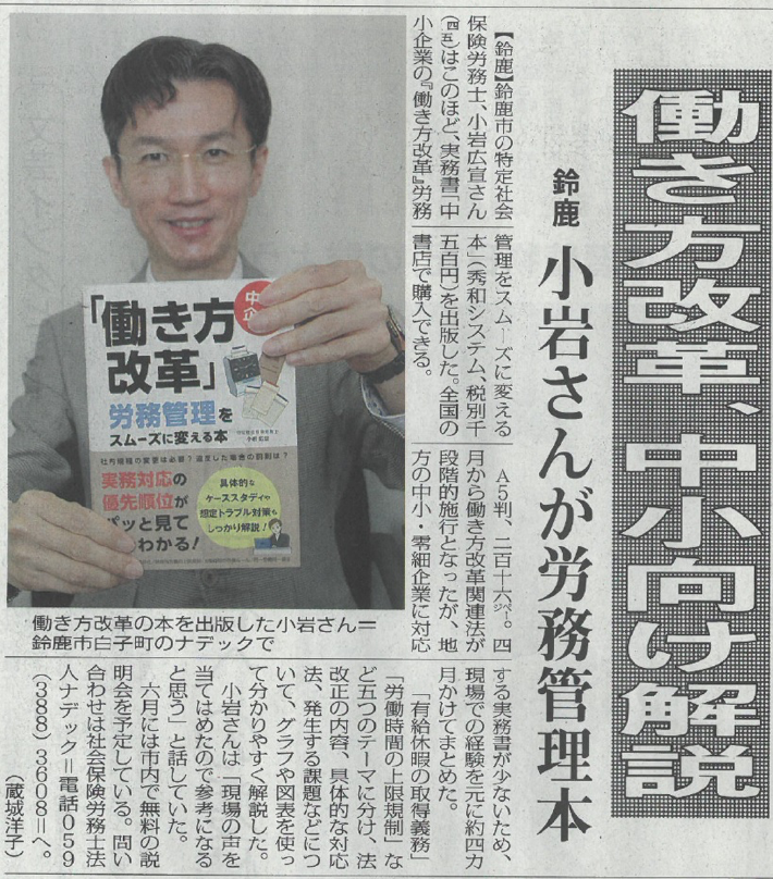 「伊勢新聞」2019年4月21日号に、新刊『中小企業の「働き方改革」労務管理をスムーズに変える本』(秀和システム)が紹介されました。