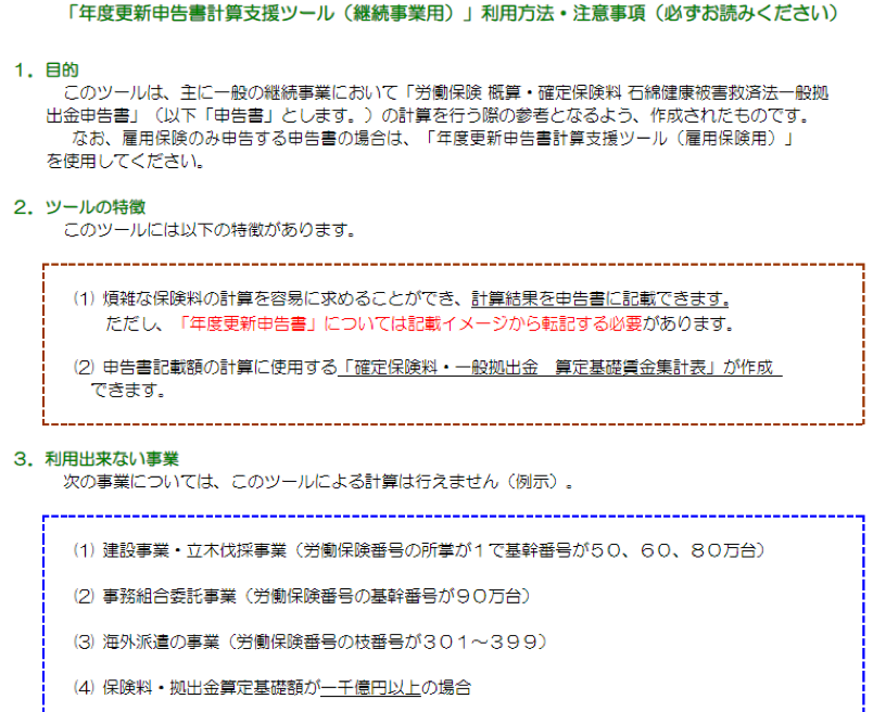 年度更新の実務の流れはとても複雑で、なおかつ申告書に記入するまでの準備が大変なことから、厚生労働省から「年度更新申告書計算支援ツール」というエクセルシートが公開されています。このシートはとても便利なので例年利用する人が多いのですが、今年は特に雇用保険料率の計算に伴うチェック項目も増えるため、さらに必要性が高まると思います。シートには、①継続事業用、②雇用保険用、③建設事業用の3種類がありますが、建設事業などの2元適用事業の業種を除いて継続事業用のシートを使うことになり、こちらで雇用保険料も労災保険料も計算することができます。