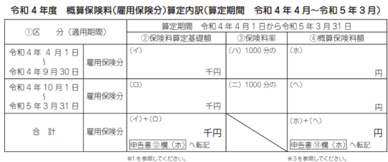 なお、令和4年度においては、年度途中で雇用保険率が変更される予定であることから、概算保険料(雇用保険分)の算定方法が例年と異なります。詳しくはP.16の《概算保険料(雇用保険分)算定に係る留意事項》をご確認ください。