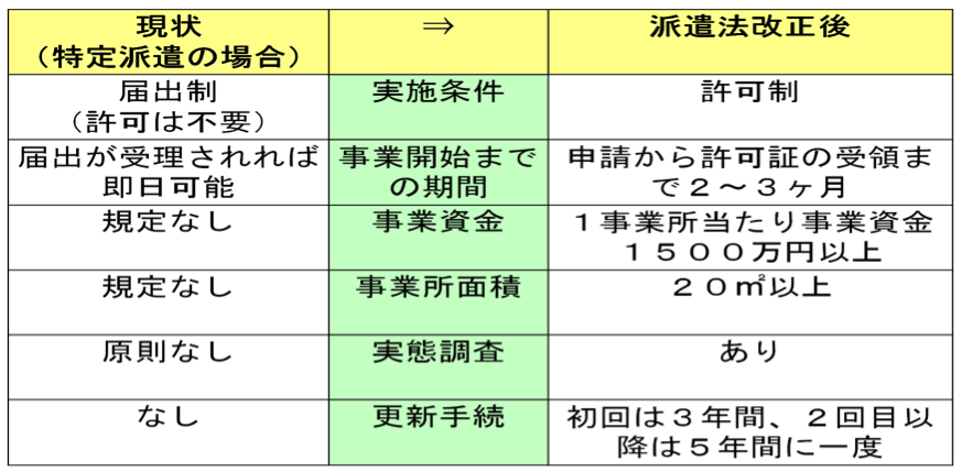 労働者派遣法については、特定労働者派遣事業の廃止(許可制への一本化)と派遣期間制限の仕組みの見直しを軸とする内容であり、同内容の改正案が国会に提出されるのは3回目となります。こちらは成立した場合、9月1日施行となりますので、実務対応としてはかなりタイトなスケジュールとなります。