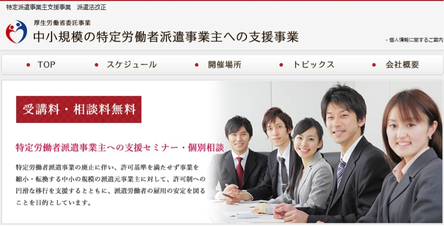 そこで厚生労働省でも「特定労働者派遣事業の廃止に伴う中小規模の派遣元事業主への支援事業」を実施しており、委託実施機関を通じて全国での支援セミナーや相談会などを開催しています。