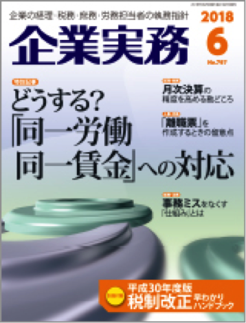 日本実業出版社が発行している、経理・人事・労務などの実務の専門誌『企業実務』6月号に、「どうする?『同一労働同一賃金』への対応」 について執筆しました。今までも何度か同誌には寄稿させていただいていますが、今回はなんと巻頭の「特別記事」でした。表紙にも背表紙にも大きく記事名が書かれると、少し気恥ずかしいですね。