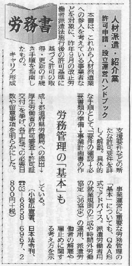 「労働新聞」、2016年4月25日号の書評欄「労務書」のコーナーに、小岩広宣著『人材派遣・紹介業許可申請・設立運営ハイドブック』(日本法令)が紹介されました。